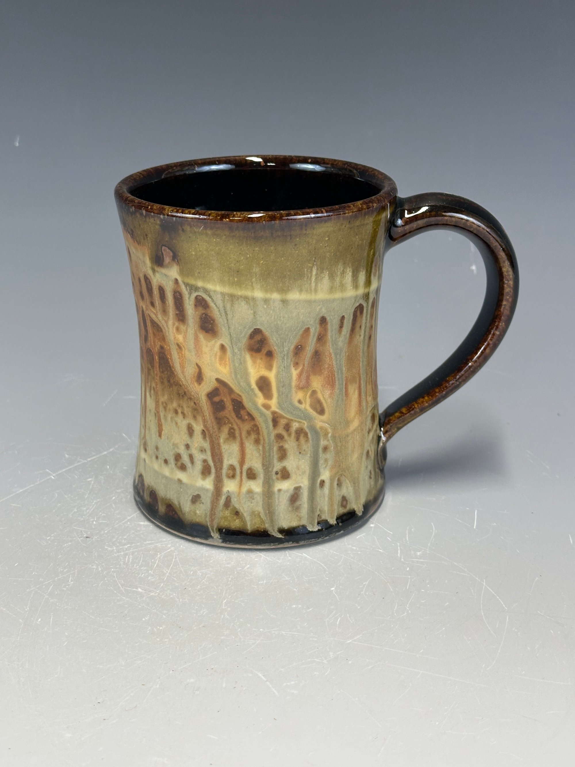Influenced by classical architecture, I have really grown to love this shape in mugs. Its strong, smart, stable, and delivers smoothly to the awaiting parched lips. This one is just under 5 inches tall.