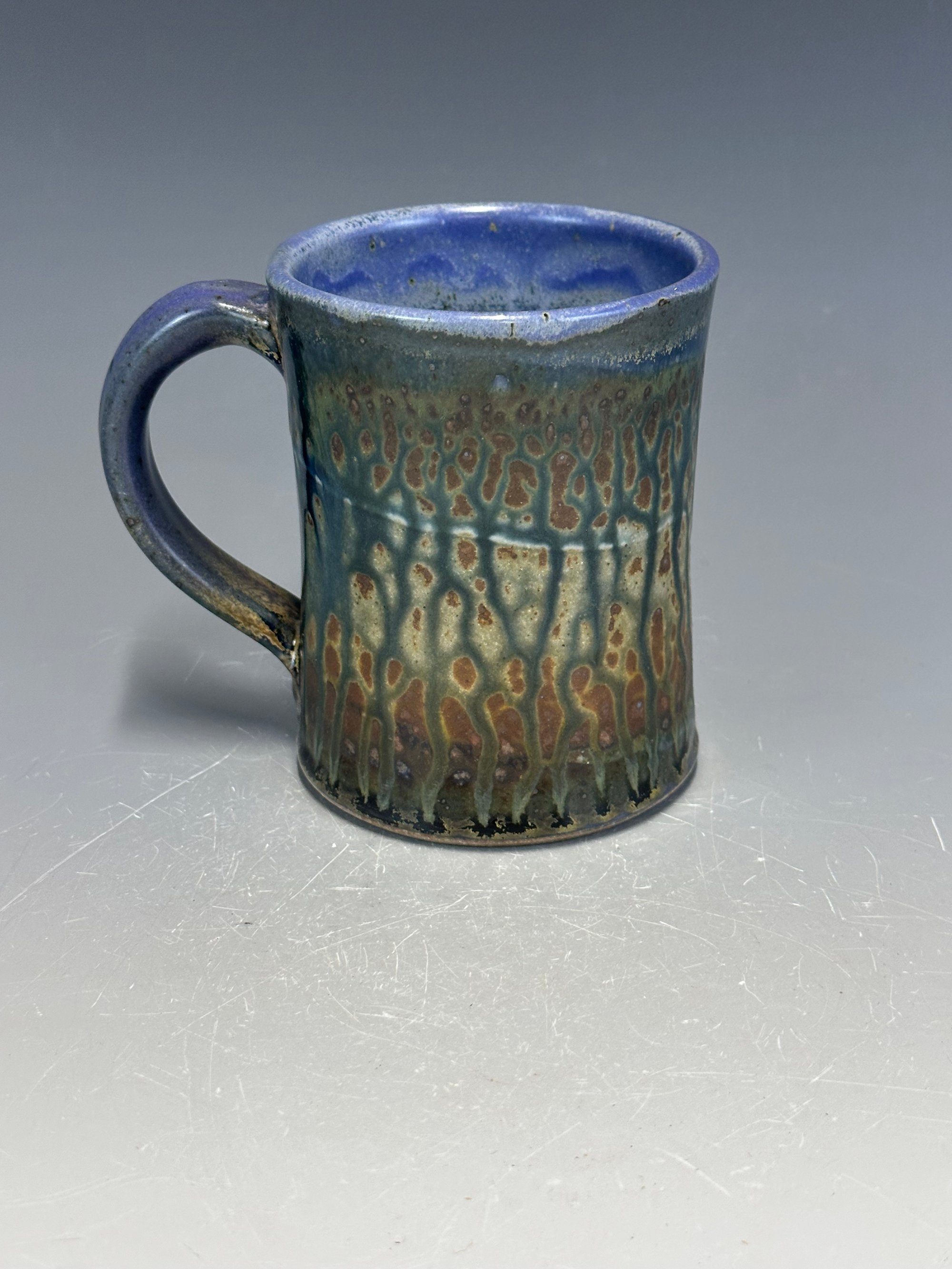 Influenced by classical architecture, I have really grown to love this shape in mugs. Its strong, smart, stable, and delivers smoothly to the awaiting parched lips. This one is 4 1/2 inches tall.