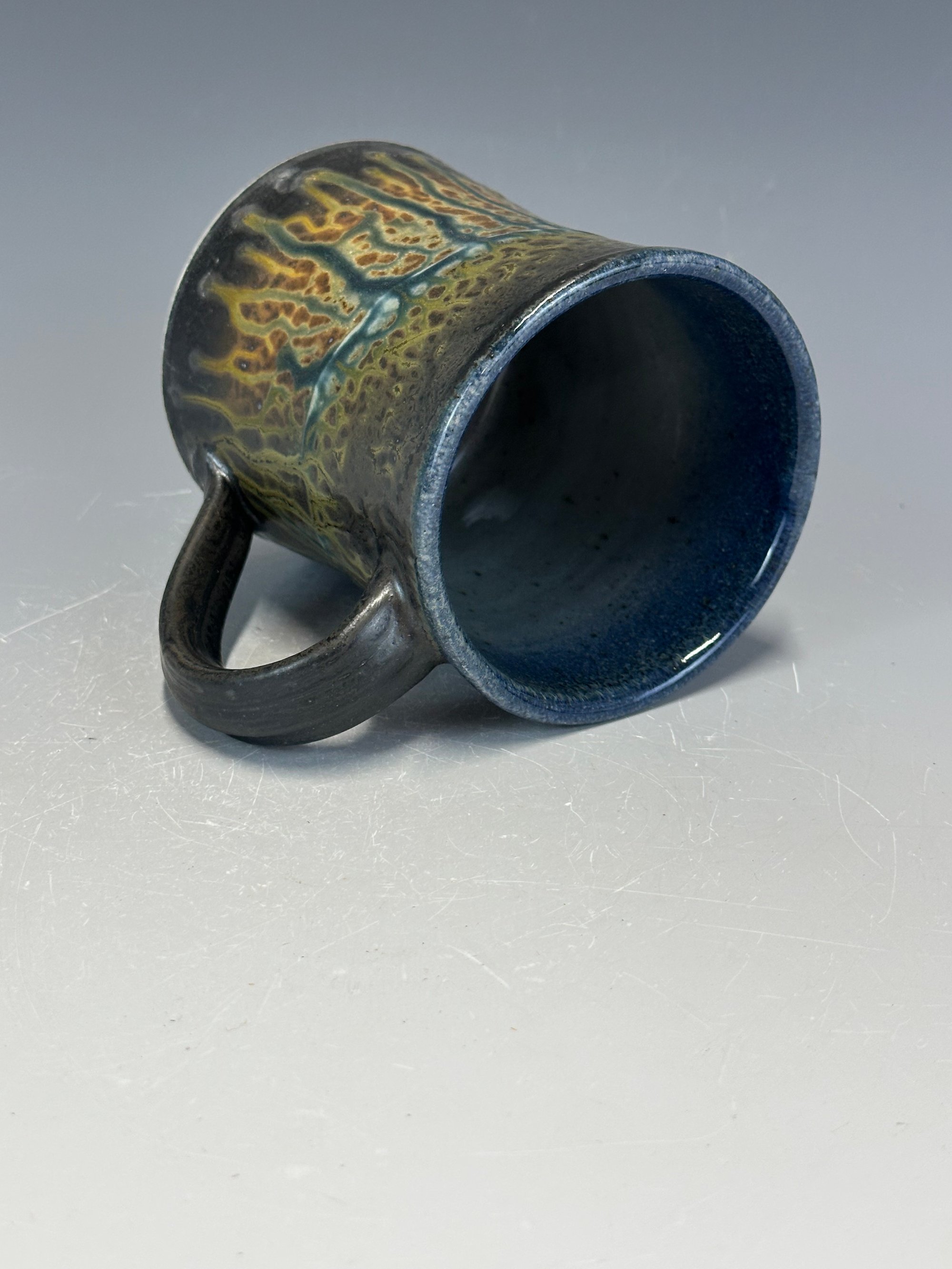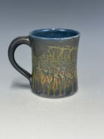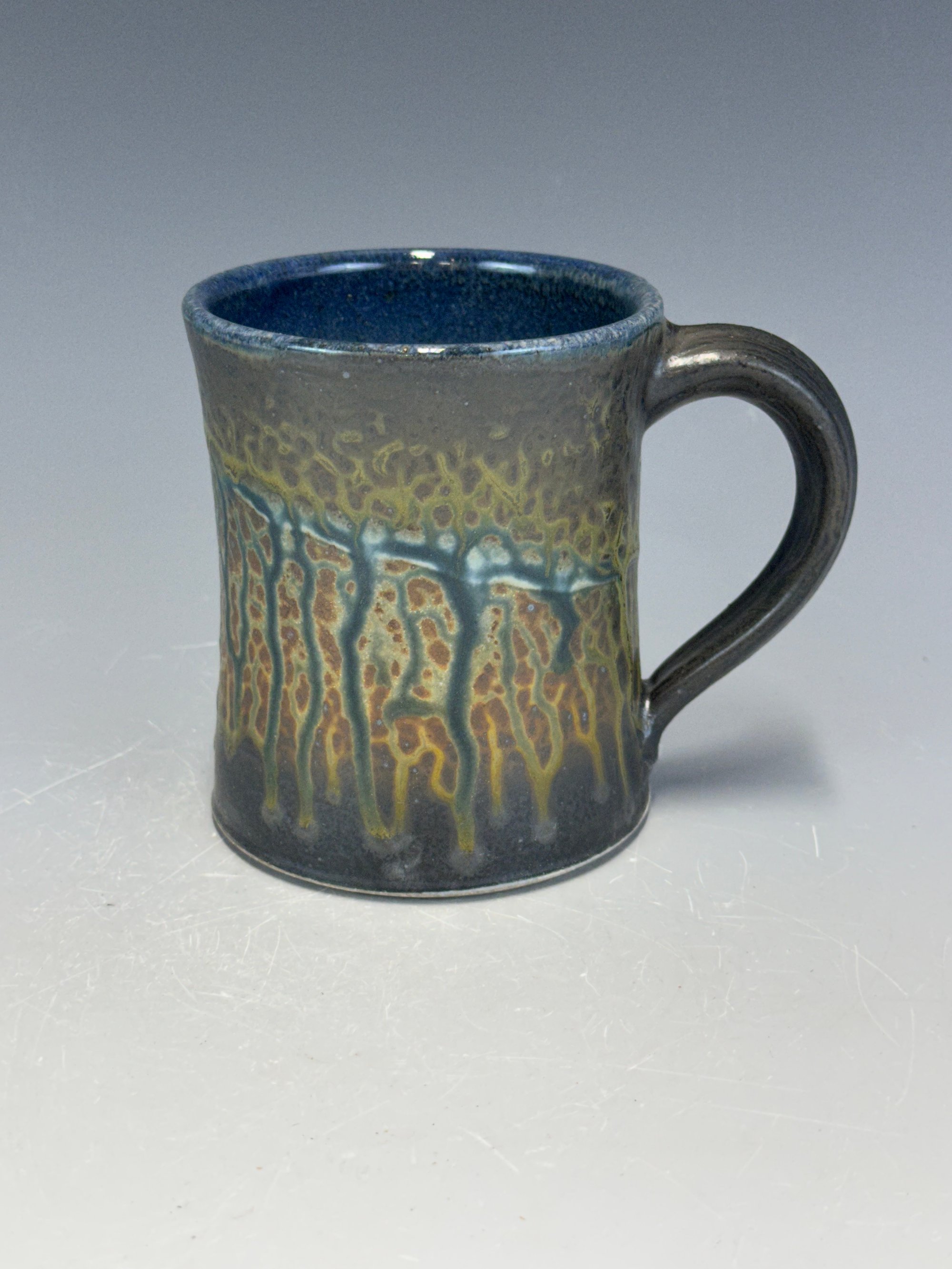 Influenced by classical architecture, I have really grown to love this shape in mugs. Its strong, smart, stable, and delivers smoothly to the awaiting parched lips. This one is 4 1/4 inches tall.