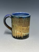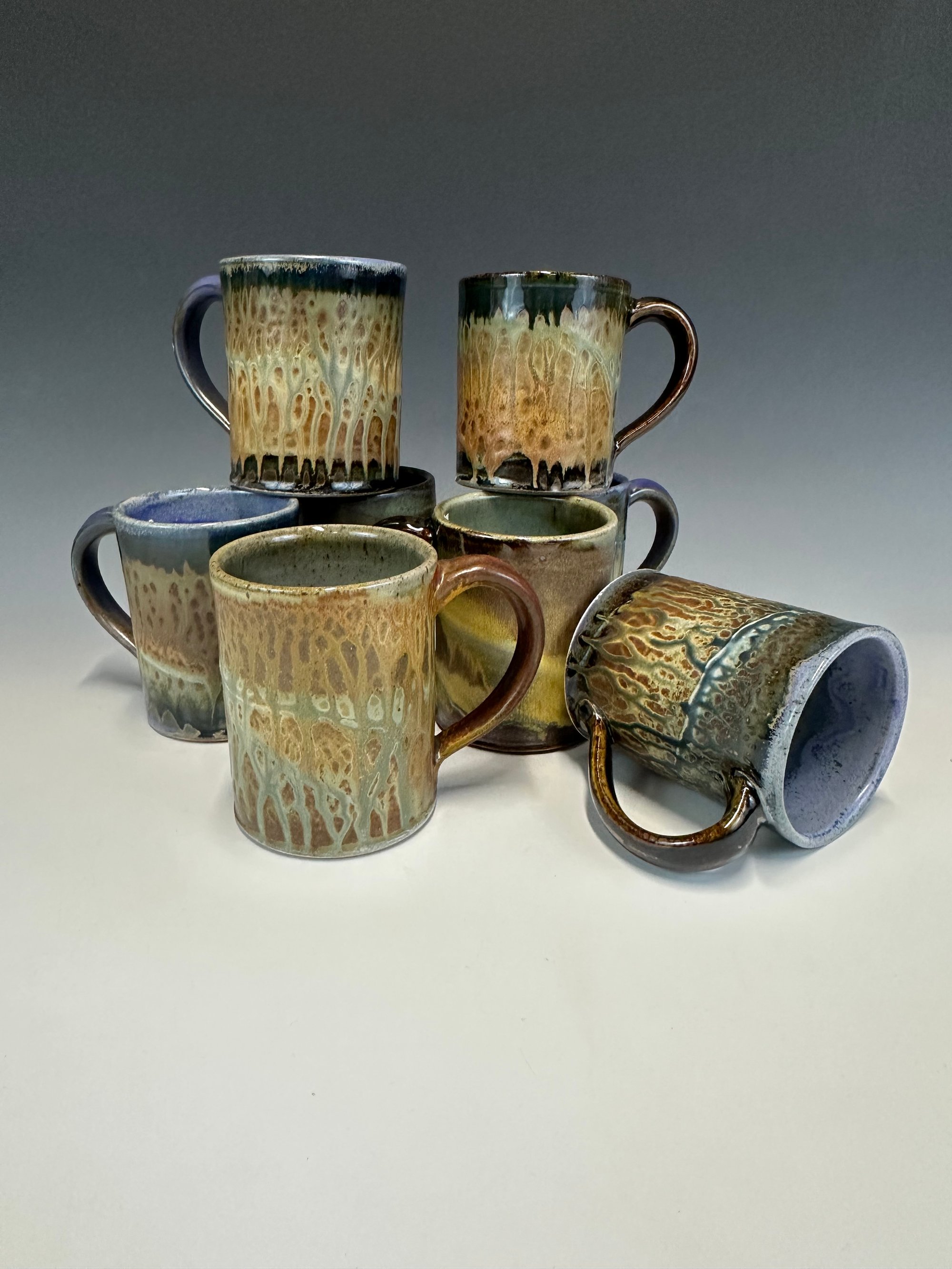 A straight forward mug for everyday use. The shape of this mug is often referred to as the "diner mug," but these are quite a bit more jazzy. And of course, it is microwave and dishwasher safe. These are about 4 1/8 - 4 1/4" tall.