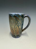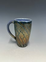 A nice curve walled mug with diagonal striping and a long handle. This will fit in your cup holder and your dishwasher. It's about 5 3/4 inches tall.